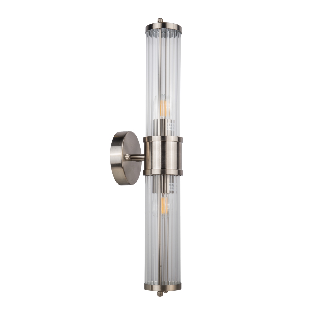 The elegant Eleanor wall light combines timeless design with modern sophistication, perfect for adding a touch of luxury to any bathroom. Available in Brushed Brass and Satin Chrome finishes, this IP44-rated fitting features a sleek tubular glass shade with delicate ribbed detailing that beautifully diffuses light. Ideal for placing beside mirrors or vanities, the Eleanor brings both style and practicality to your space.